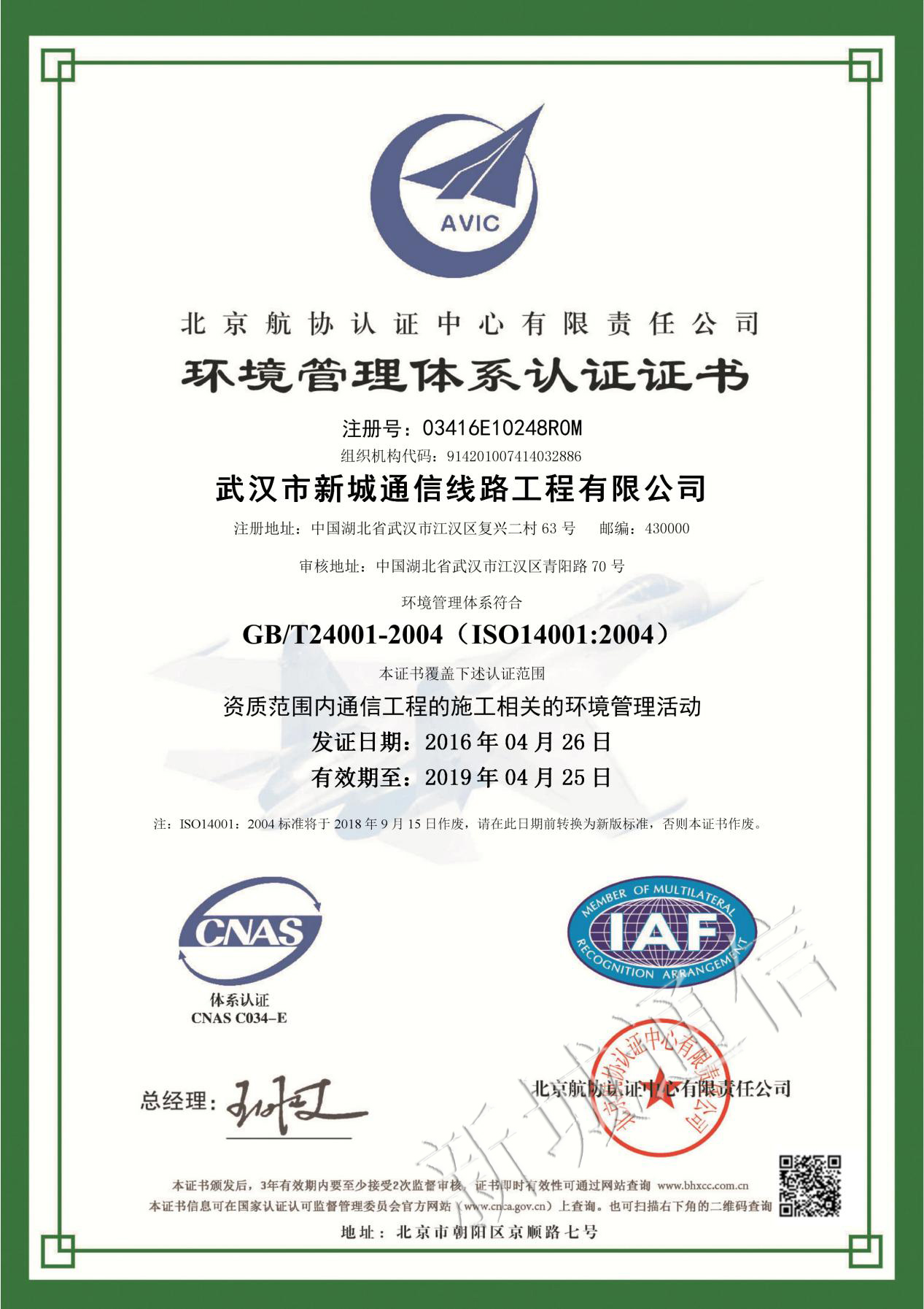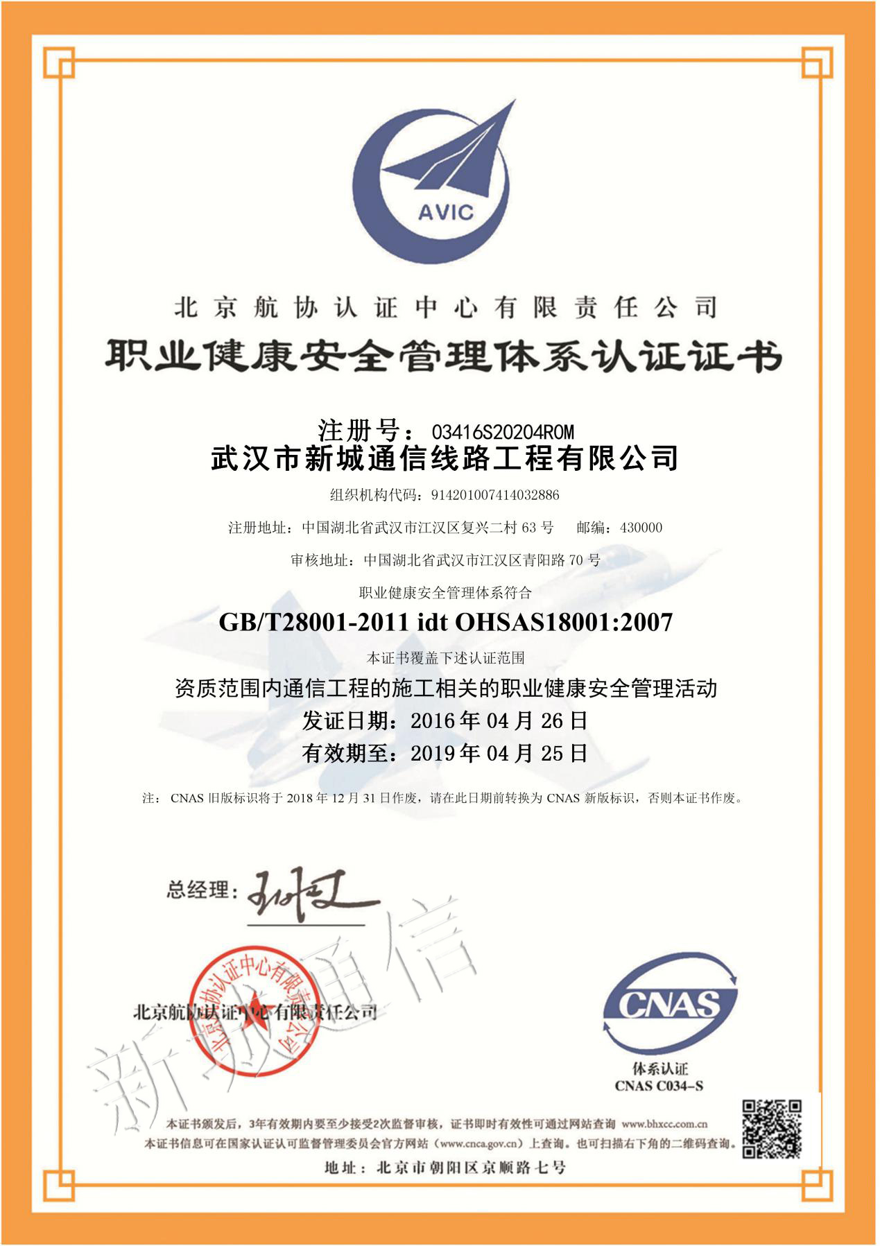 职业康健清静治理系统认证证书